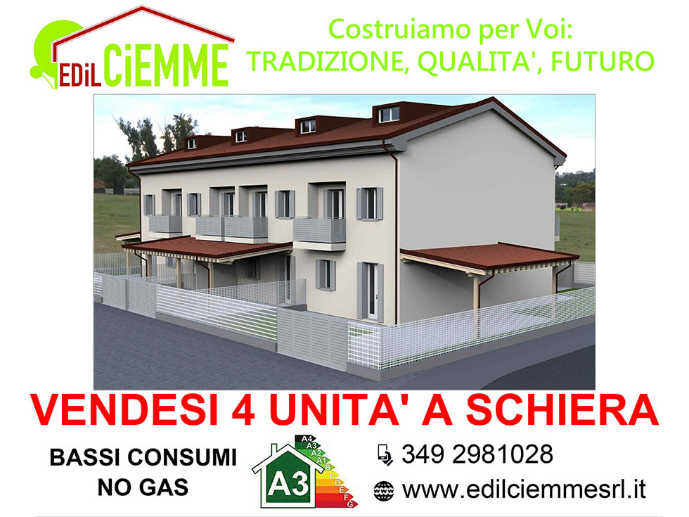 VENDUTE TUTTE le QUATTRO VILLETTE A SCHIERA, Comune di Arzergrande Via Don L. Milani, ai confini con PIOVE DI SACCO, strategica alle molteplici vie di comunicazione principali, in contesto residenziale tranquillo immerso nel verde con adiacente parco giochi attrezzato ed ampio parcheggio in lottizzazione; dotate di giardino privato, accessi indipendenti e POSTO AUTO coperto in proprietà; accesso in Zona Living di circa 50 mq, con angolo cottura o a scelta cucina separata, disimpegno, ripostiglio e bagno/lavanderia al piano terra; scale d’accesso alla zona notte composto da un grande disimpegno con la possibilità di posizionare piu’ armadi, camera matrimoniale di 15 mq con ampio poggiolo/loggia, altre due camere di oltre 10,5 mq, una dotata di poggiolo/loggia, un spazioso bagno, ed inoltre, a scelta, mansarda di circa mq 45.Abitazione a BASSO CONSUMO ENERGETICO, NO GAS ! dotata di IMPIANTISTICA MODERNA di alta qualità, volta al risparmio energetico ad allo sfruttamento di ENERGIE RINNOVABILI; come ad esempio impianto FOTOVOLTAICO, POMPA DI CALORE IDRONICA DAIKIN per RISCALDAMENTO, ACQUA CALDA SANITARIA E a scelta anche su richiesta anche RAFFRESCAMENTO (alimentata direttamente con la autoproduzione dell’impianto fotovoltaico), VIDEOCITOFONO A COLORI, predisp. VMC ed ALLARME e tanto altro…… FINITE a scelta CON POSSIBILITA' PERSONALIZZAZIONE di pavimenti e finiture, a scelta con controllo funzioni principali della casa, direttamente da impresa COSTRUZIONI ARTIGIANA, Il vero MADE in ITALY.